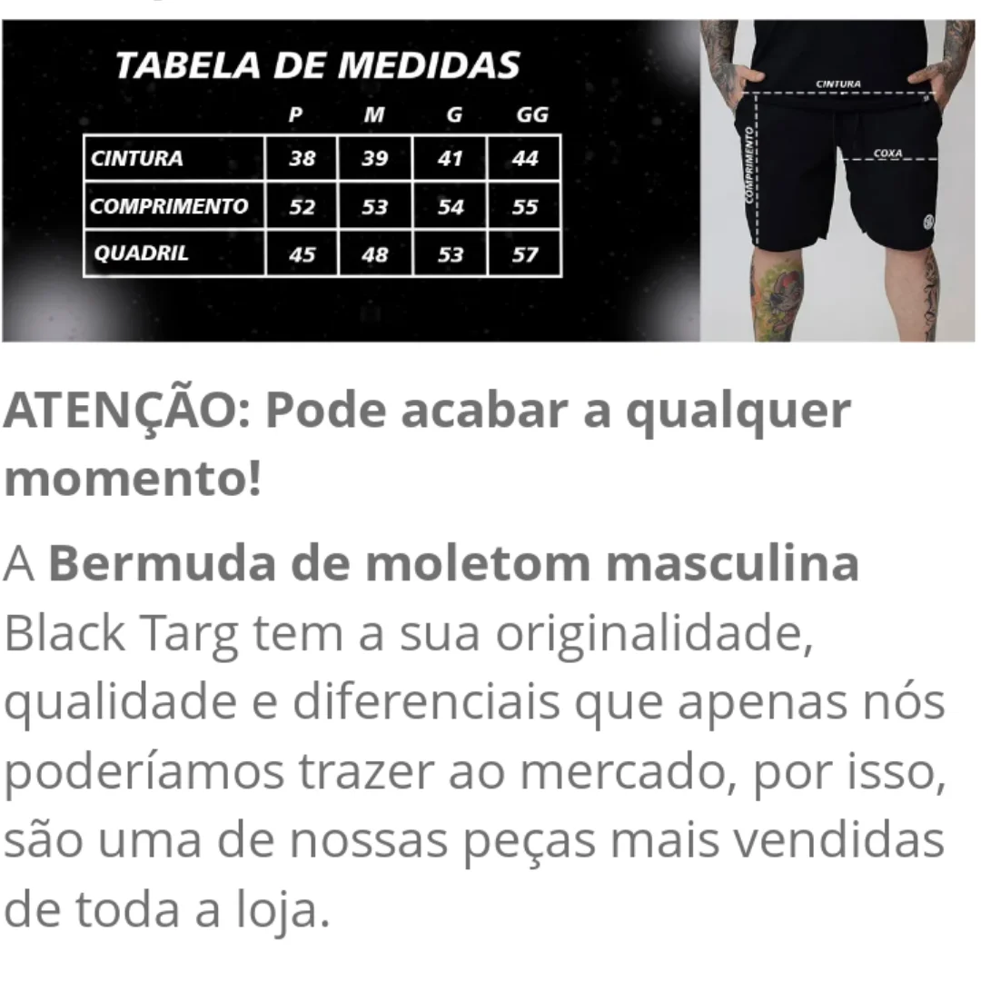 A Bermuda de Moletom tinha uma nova modelagem que proporcional muito conforme e um excelente caimento no corpo. Sua versatilidade permite criar diferentes combinações para utilizar-la em todos os tipos de ocasionões no verão, seja para passear, para o dia a dia ou até mesmo para o trem. Todos os detalhes foram pensados para que você viva momentos incríveis com muito estilo e conforme! Produto 100% ORIGINAL, Cor: Preta - Marca: Black Targ